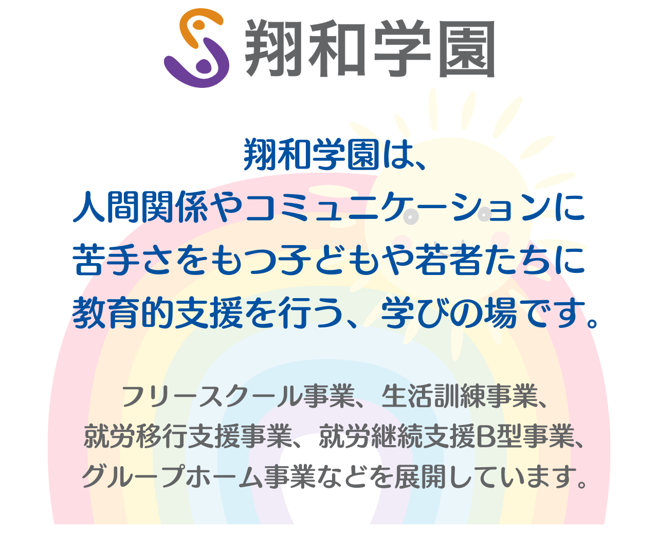翔和学園は、小中学部・高等部、大学部、ワークセンター翔和、グループホーム翔和とそれぞれの段階で、「人間の生きていく気力を育てる」ことを通じて社会性を伸ばすことを目的にしています。心理、医療、就労の専門家や保護者との連携により、学習場面や生活場面で困難を抱える子どもの早期発見・療育から就労、そして自立までの一貫した支援の実現を目指します。