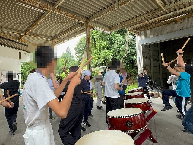 小田切キャンパスの自由な立地を生かして、和太鼓演奏に取り組んでいます。太鼓の練習では、物を丁寧に扱う力や何度失敗しても諦めずに努力する力を身につけています。